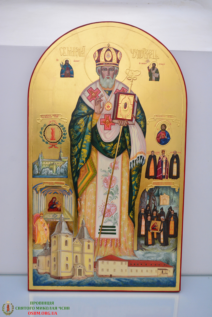 Вгорі зліва і справа від постаті святого розташовано зменшені поясні зображення Св. Василія Великого і Св. Йосафата Кунцевича – засновника монашого ордену Василіян.