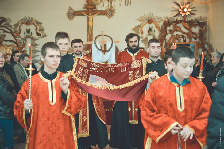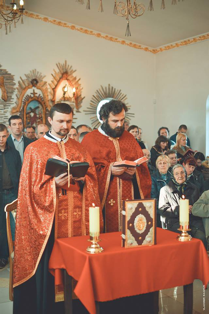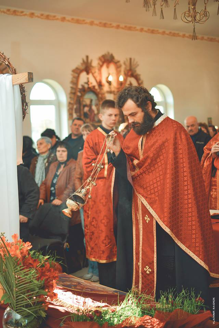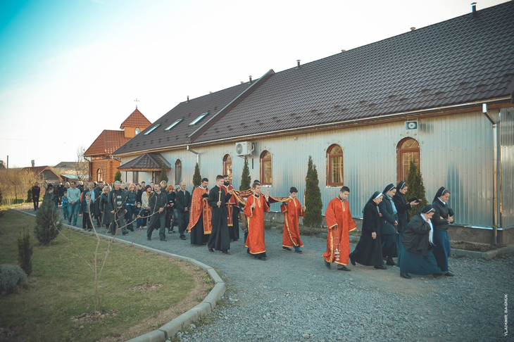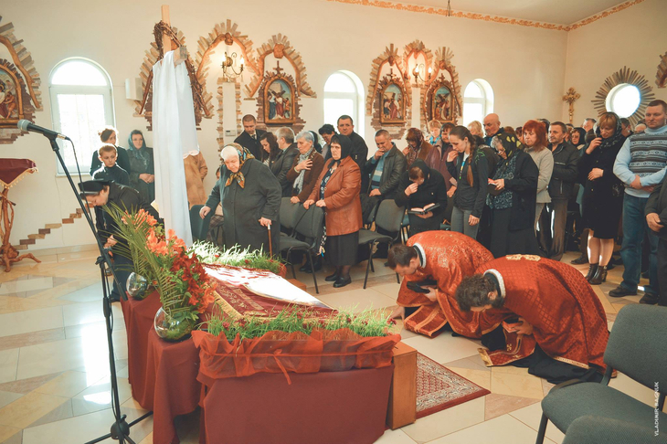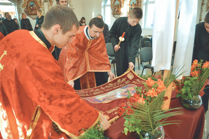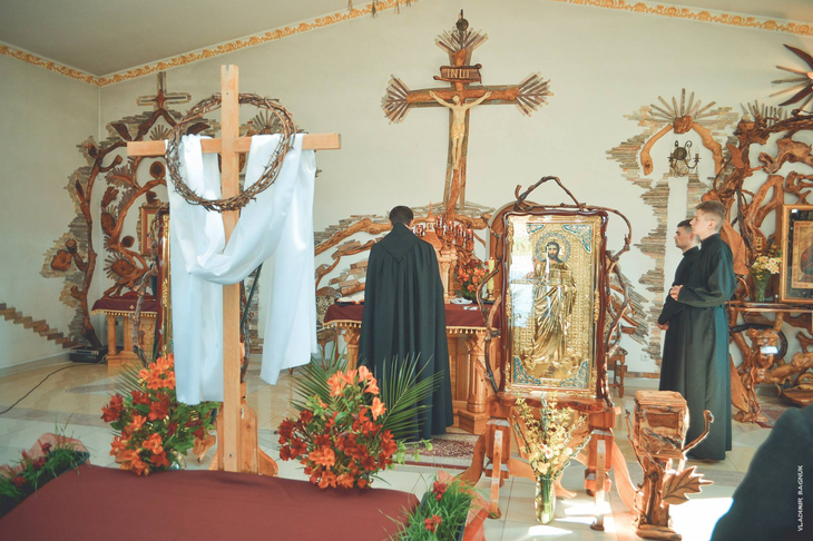 Плащаниця, виставлена в Мукачівському монастирі Отців Василіян, у Страсну П’ятницю, 10 квітня 2015 року Божого.